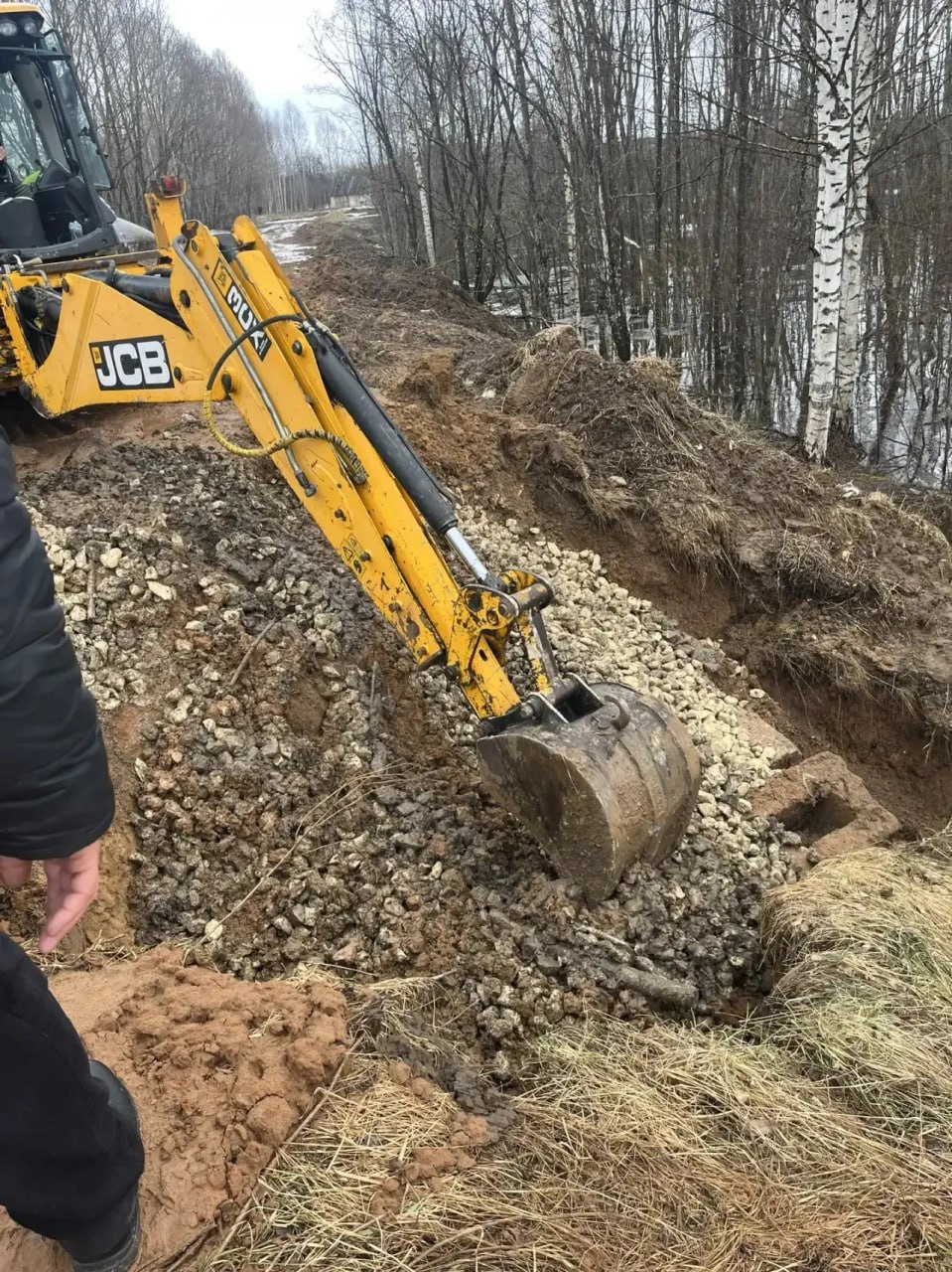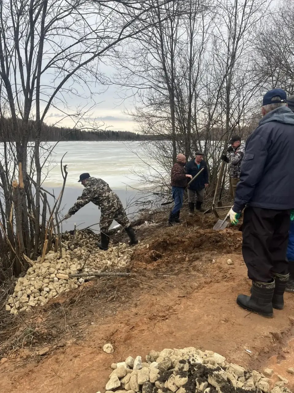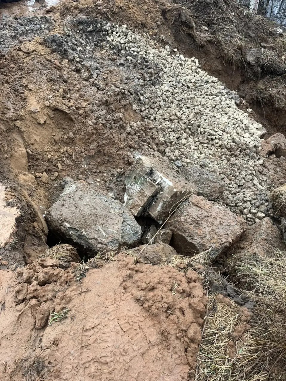 Поврежденный участок укрепили бетонными блоками и щебнем.