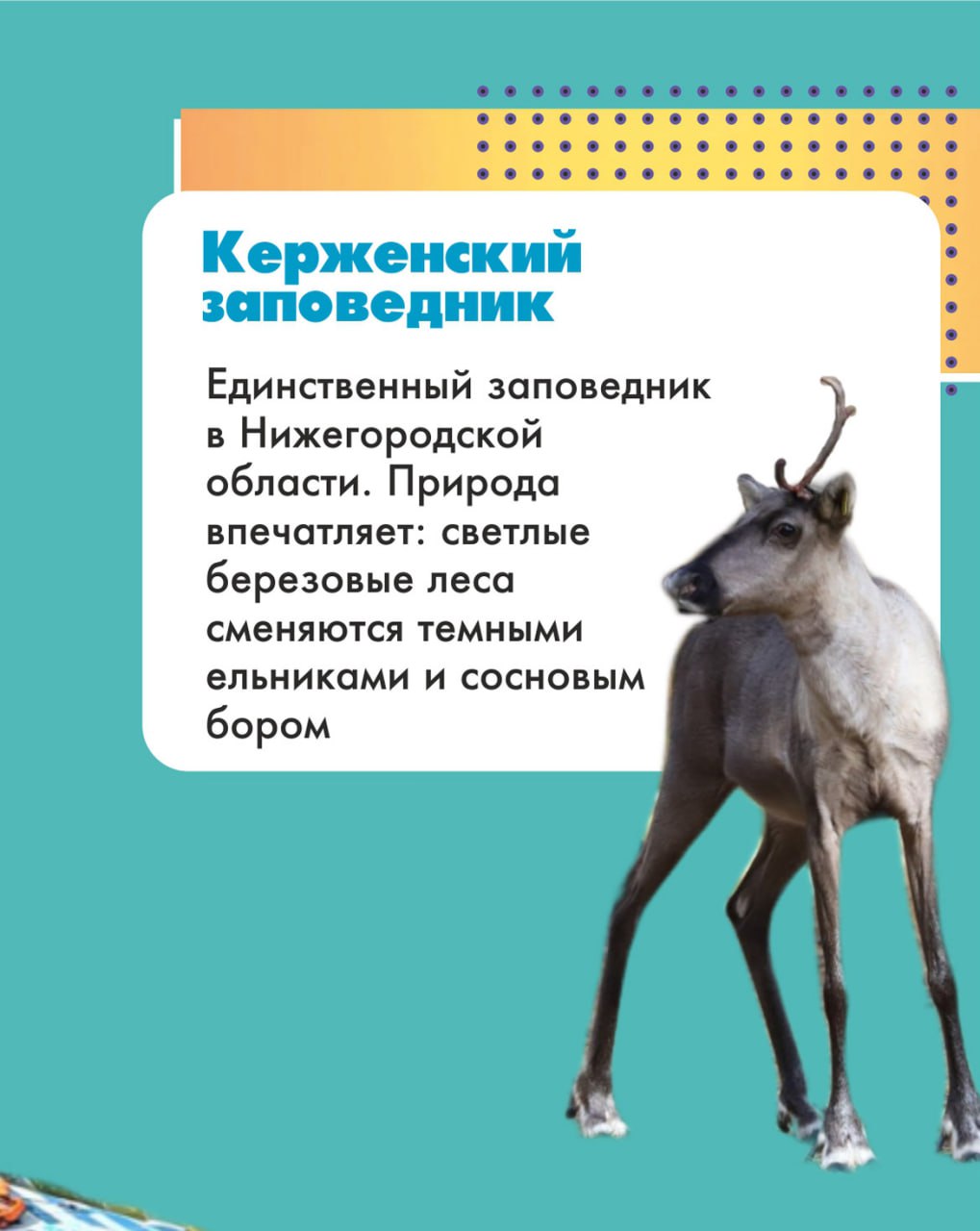 Побывай на Светлояре — это одно из самых глубоких и загадочных озёр России, которое называют русской Атлантидой. Съезди в Керженский заповедник — там много краснокнижных зверей, в том числе северные олени. Это гербовое животное Нижегородской области было истреблено в начале ХХ века, теперь специалисты занимаются восстановлением популяции. А искателей приключений не оставят равнодушными Ичалковские пещеры. Их восемь, и каждая по-своему уникальна!