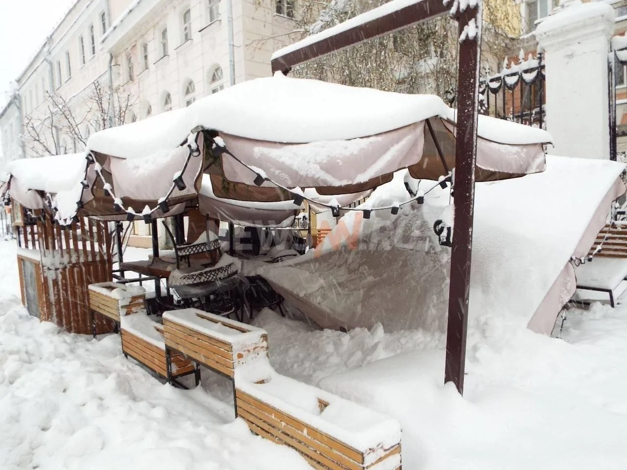 Сугробы в Нижнем Новгороде отменили планы на лето: там выпало столько снега, что раздавило террасу ресторана
