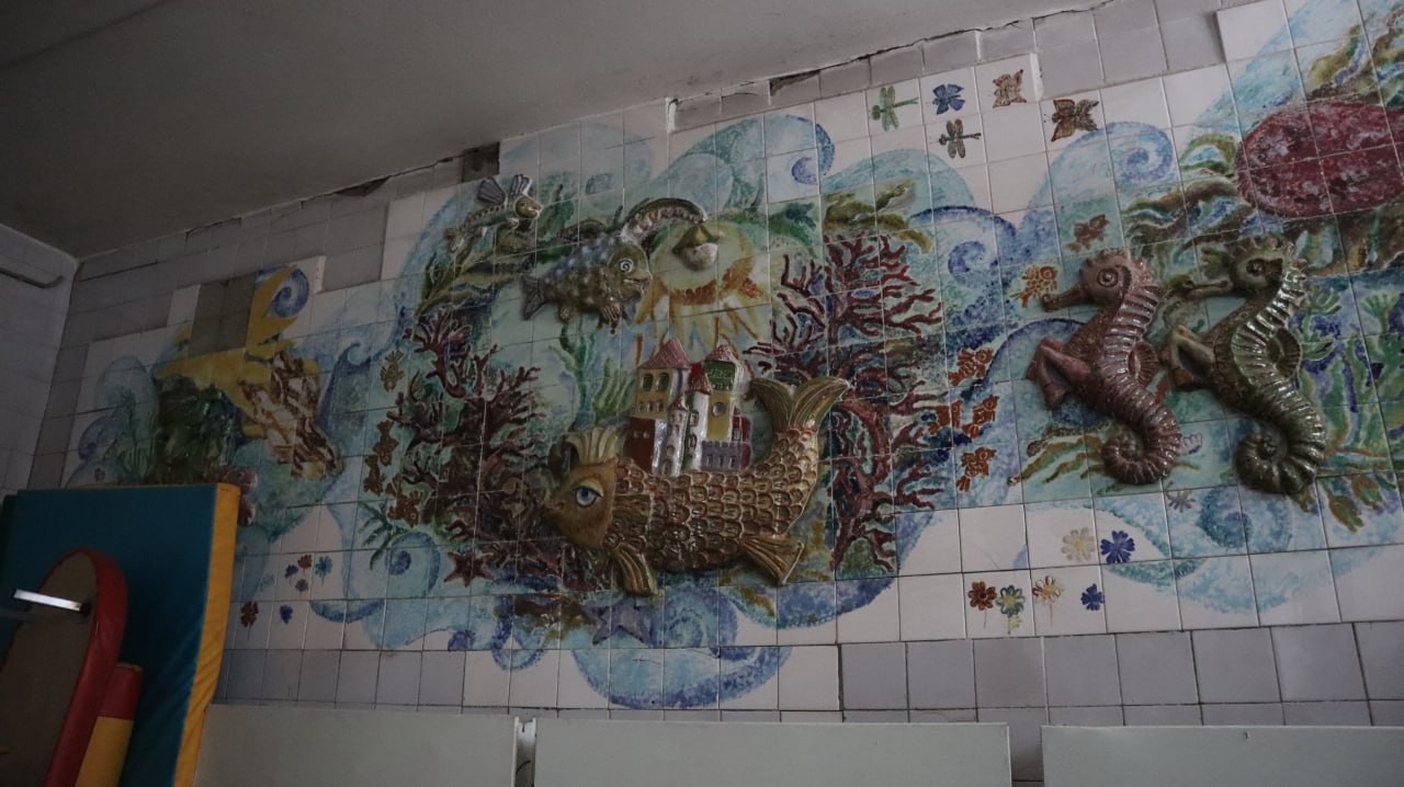 Это ещё один проект по сохранению художественных произведений советского периода. Сейчас панно находятся в неработающем бассейне детского садика № 435 в Щербинках. Авторы – Заслуженные художники России Валерий и Татьяна Гришины.