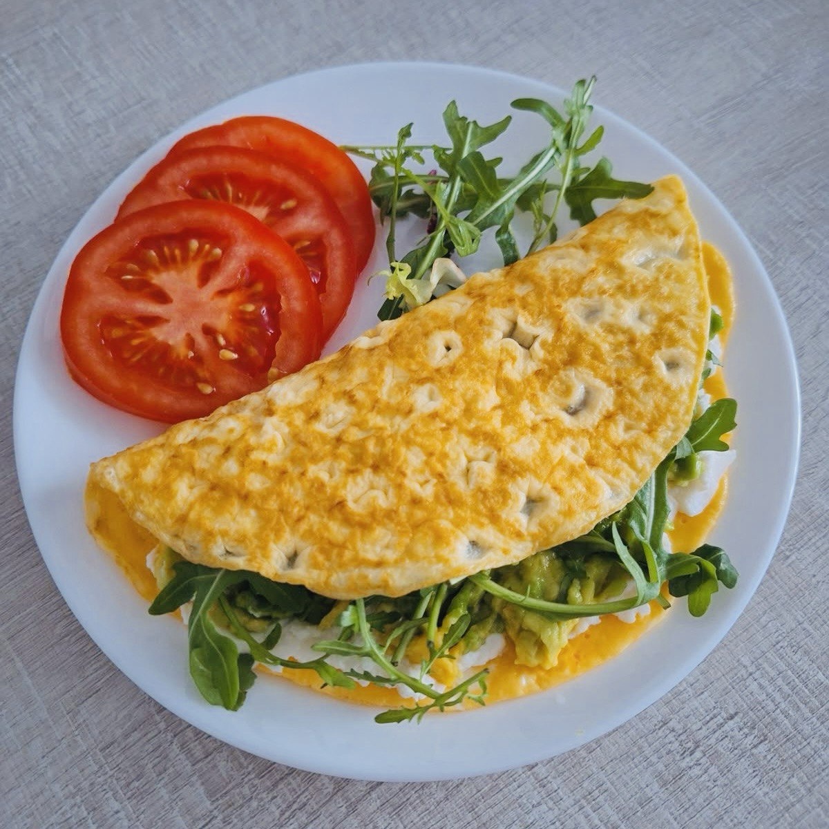 - Сборка. Когда омлет готов, аккуратно снимите его со сковороды. На одну половину выложите горкой авокадо с помидором, добавьте немного перца и нарезанной зелени.
