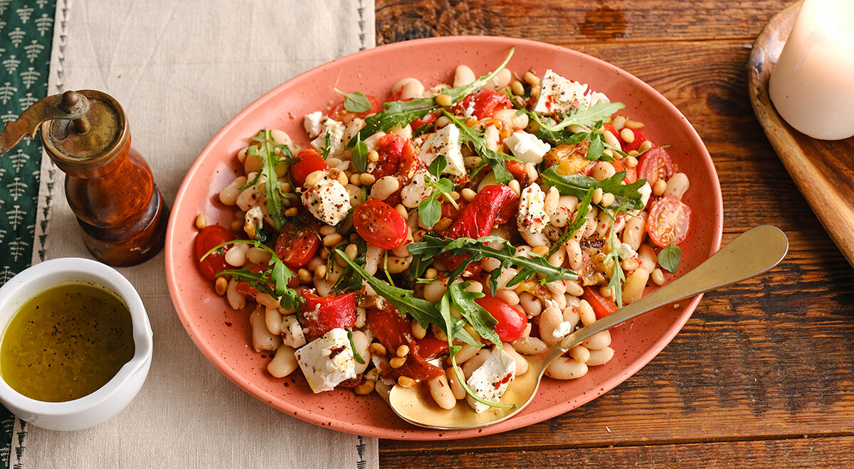 - Салат с печеным перцем и белой фасолью: легкий и питательный, идеально дополнит любое застолье.