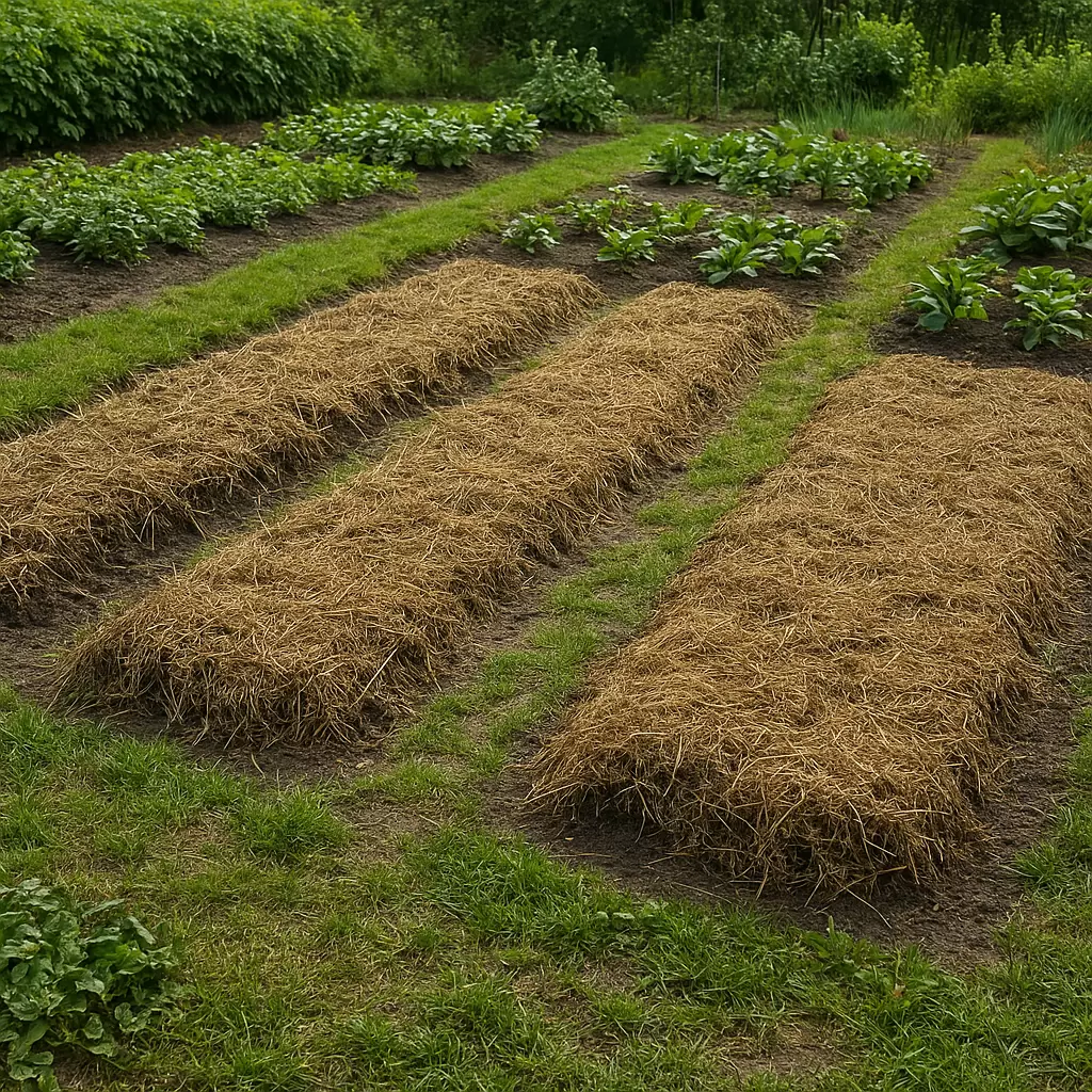 - Органика, такая как травы, листья и компост, находится на поверхности и служит мульчей, защищающей почву и обогащающей ее.