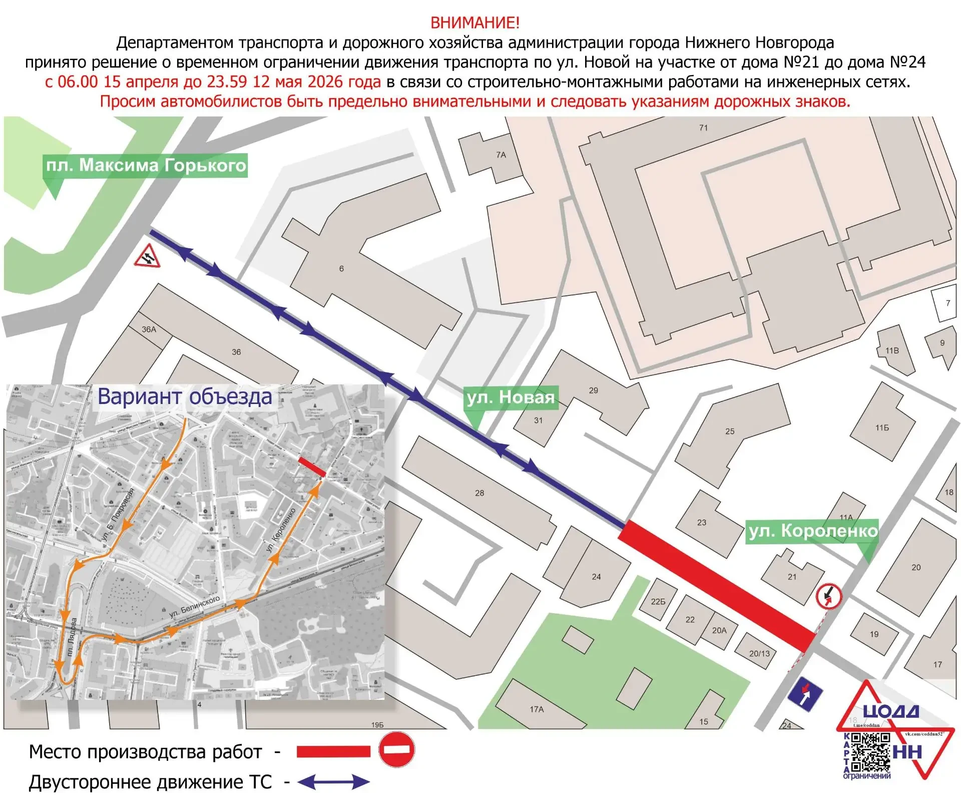 В связи с этим с 6:00 15 апреля до 23:59 12 мая на участке ул. Новой от площади Максима Горького до места проведения работ вводится двустороннее движение транспорта.