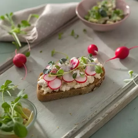- Тосты с кремом из редиса и тофу: Хрустящие тосты с кремом, основанным на мягком тофу и редисе, обещают удивительные вкусовые сочетания, которые приятно удивят ваших гостей.