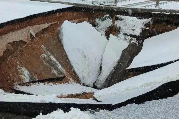 Вот такой огромный провал образовался сегодня на 19-м километре дороги Вад — Новый мир близ деревни Порецкое.