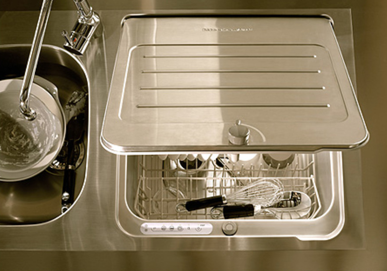 - Компактная раковина с посудомойкой — угловые участки исполнения этой зоны часто пустуют. Однако на рынке уже есть компактные посудомоечные машины, которые идеально вписываются в угол, свободно вмещая до 6 комплектов посуды. Это особенно удобно для молодых семей, где важно быстро справляться с грязной посудой.