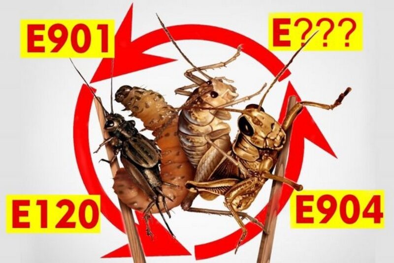 Несмотря на отсутствие строго регламентированного подхода к насекомым в пищевой промышленности, некоторые добавки, такие как красители и пищевые вспомогательные вещества, всё же происходят от насекомых. Например, краситель Е904, производящийся из экскрементов лаковых червецов, используется для глазировки продуктов.